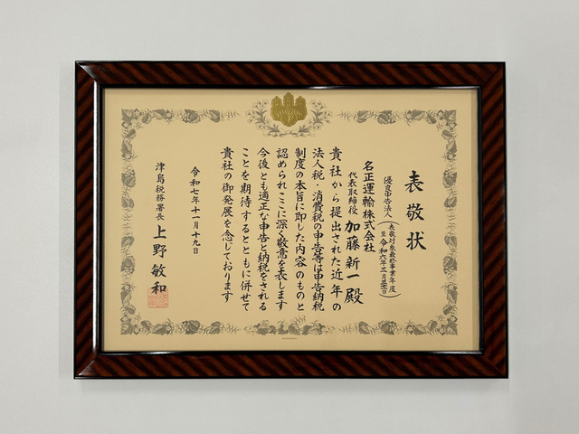 このたび名正運輸株式会社は、津島税務署より 『優良申告法人』 として選定いただきました。