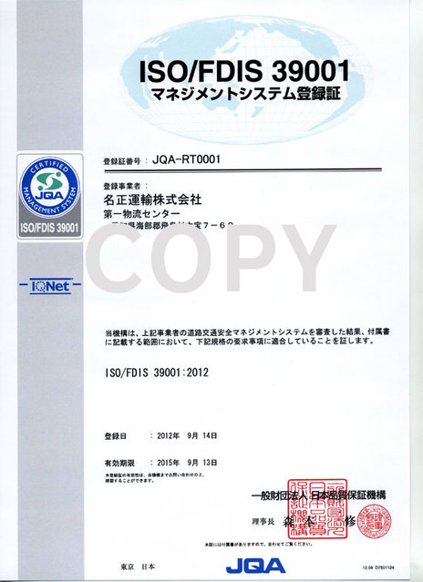 国内第一号 道路交通安全マネジメントシステムISO(FDIS)39001の認証