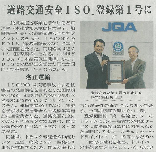 10月5日付 中部経済新聞に当社記事が一面に掲載されました。道路交通安全マネジメントシステム国際規格ISO(FDIS)39001の認証を日本で初めて取得しました。