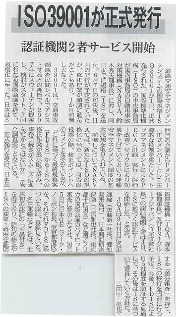 10月8日付 物流ニッポンに当社記事が一面に掲載されました。道路交通安全マネジメントシステム(ISO39001)は差分審査を経て、当社をはじめ5社に正式発行される見通しです。