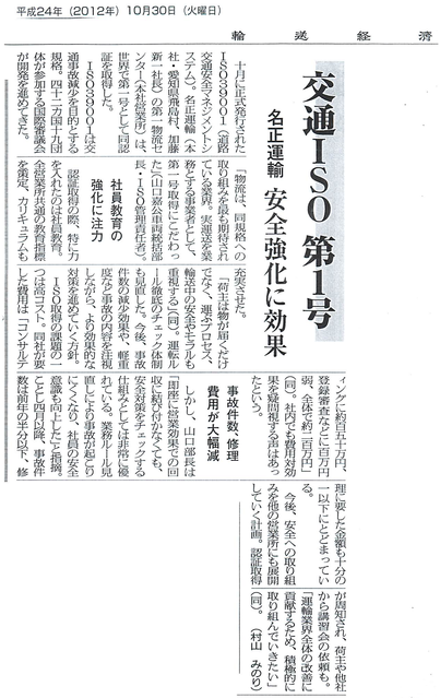 10月30日付 輸送経済に道路交通安全マネジメントシステム(ISO39001)に関する当社記事が掲載されました。
