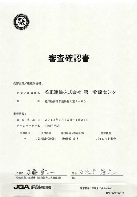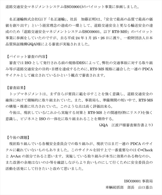 平成24年1月25~26日、一般財団法人日本品質保証機構(JQA)様によるISO39001パイロット事業審査が実施されました。