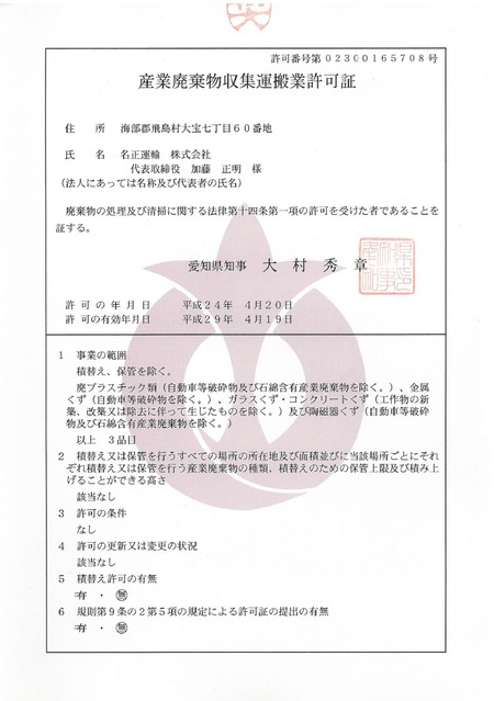 名正運輸は産業産廃棄物収集運搬許可を取得致しました。