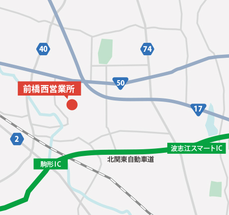 前橋西営業所は、北関東自動車道「駒形IC」から車で約10分。
